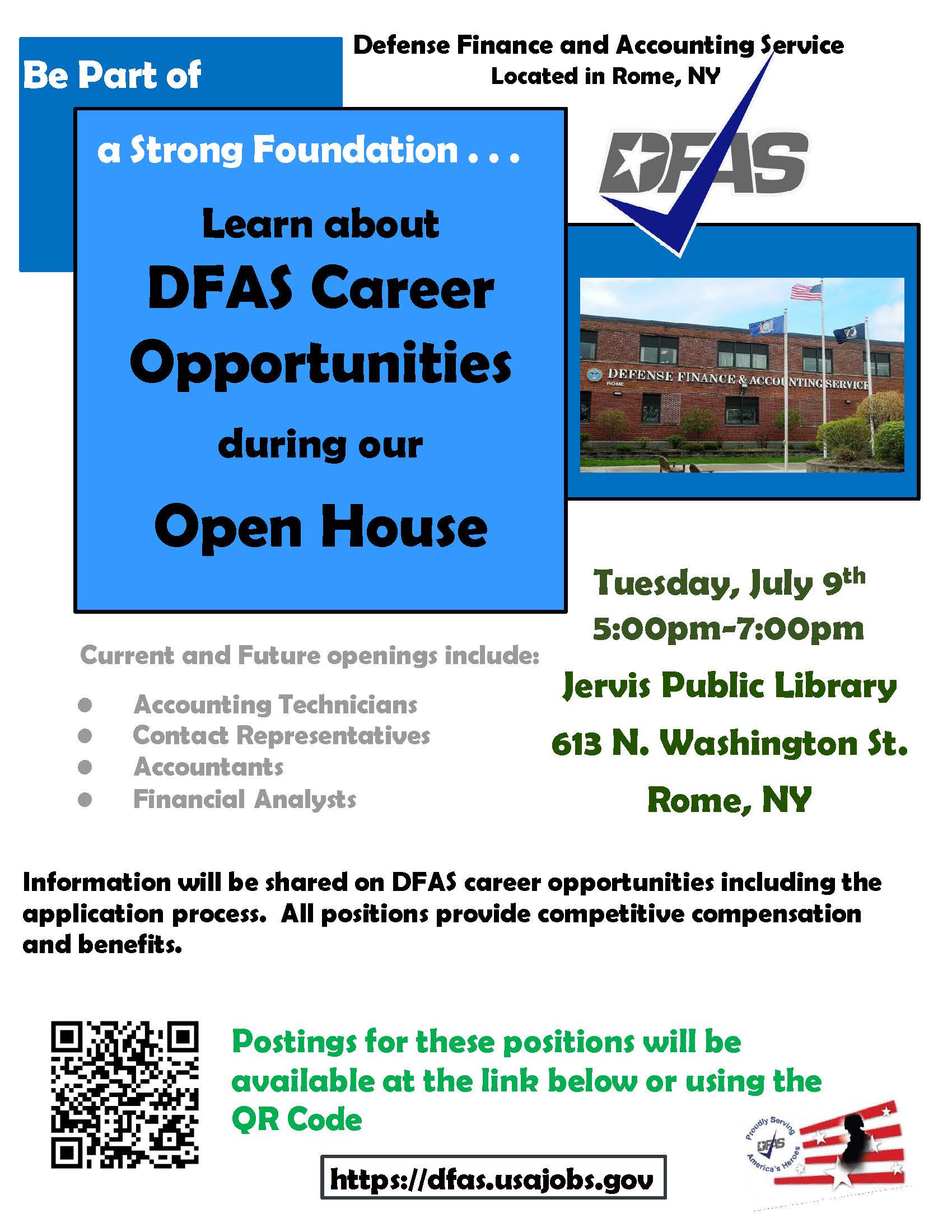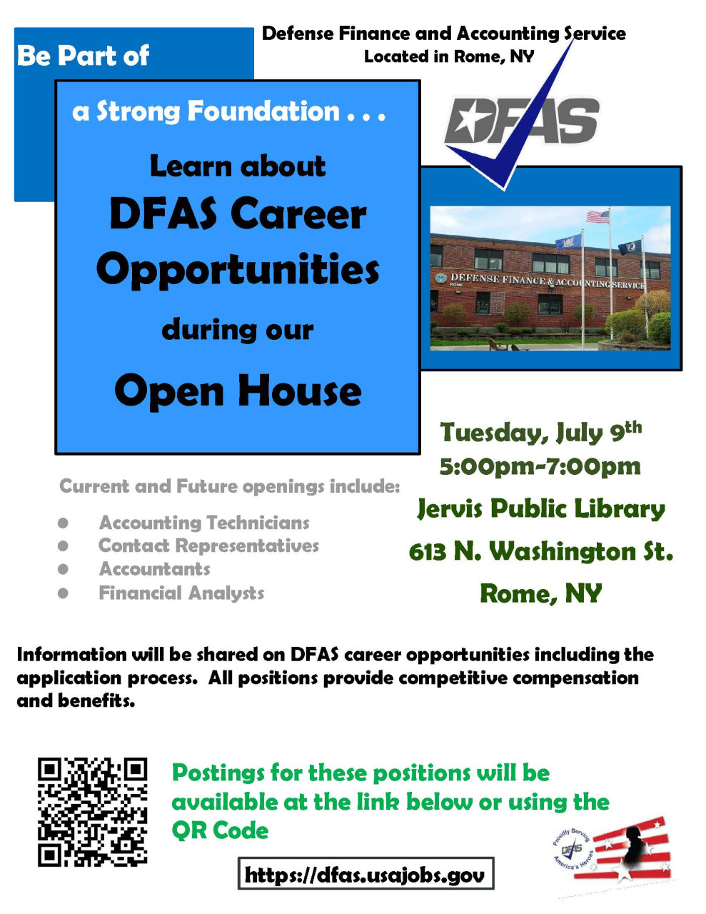 5:00PM – 7:00PM at the Jervis Public Library. 613 N. Washington Street, Rome, NY. Currently hiring for Accounting Technicians, Contact Representatives, Accountants, and Financial Analysts. Information will be shared on DFAS career opportunities including the application process.