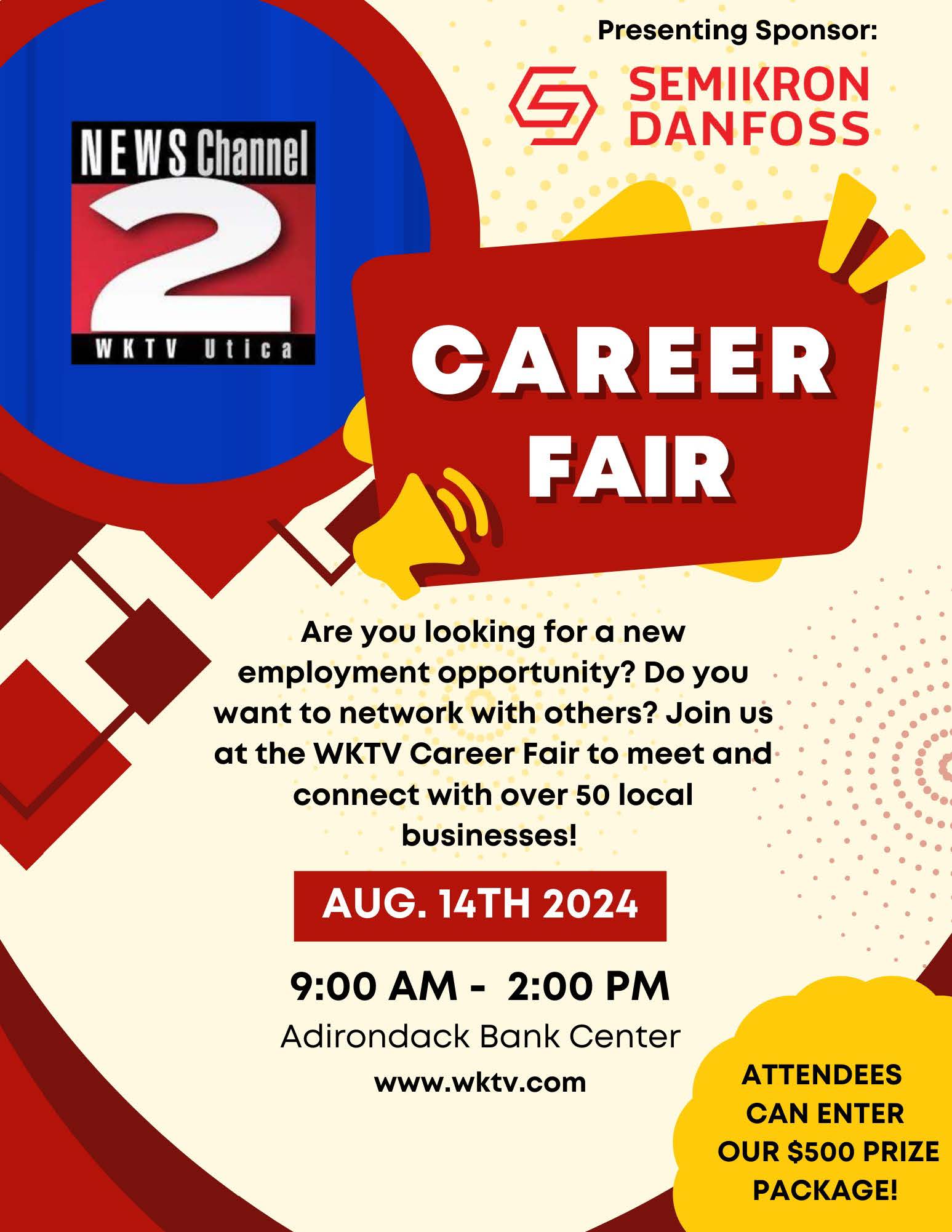 WKTV will be holding a Career Fair on August 14th from 9:00AM – 2:00PM at the Adirondack Bank Center, 400 Oriskany Street West, Utica, NY 13502.